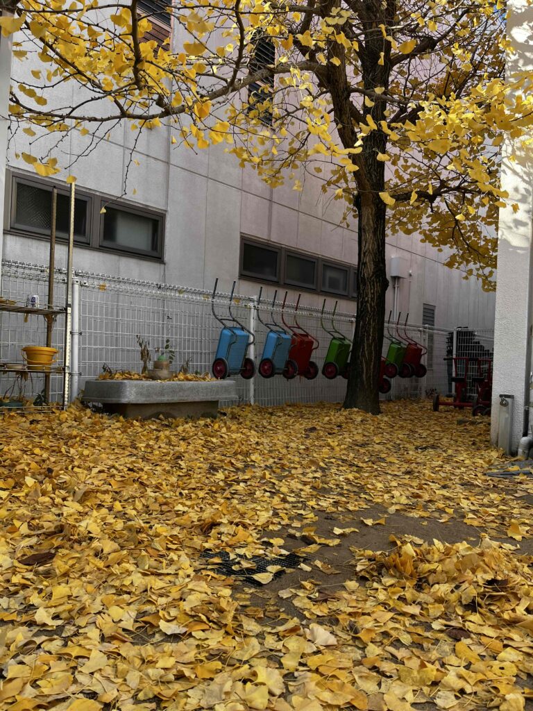 所庭の銀杏がいよいよ落葉し、木の周りが黄色のじゅうたんになりました。