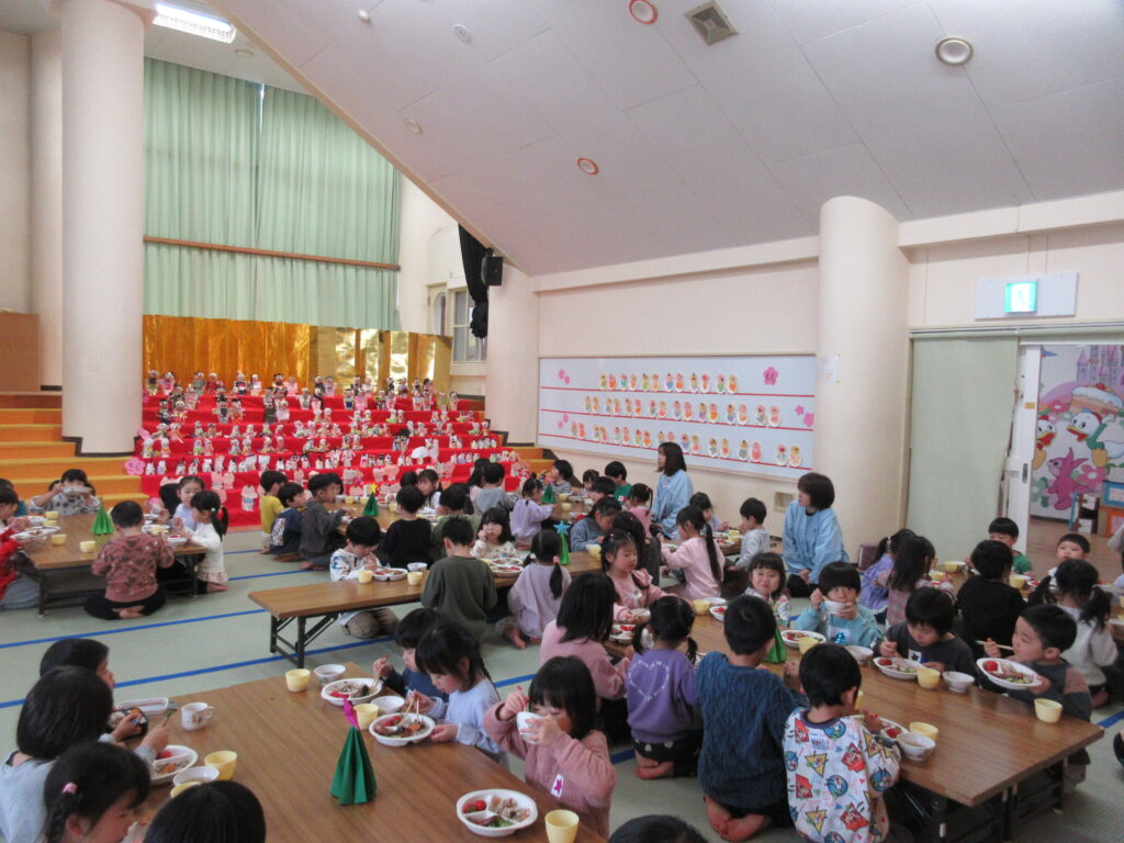 今日は、3月3日でひなまつり会と3月の誕生会があり、大きいクラスの子どもたちは、会食をしました。みんなで一緒に食べると、うれしくて、いつも以上に話が弾んでいました。
