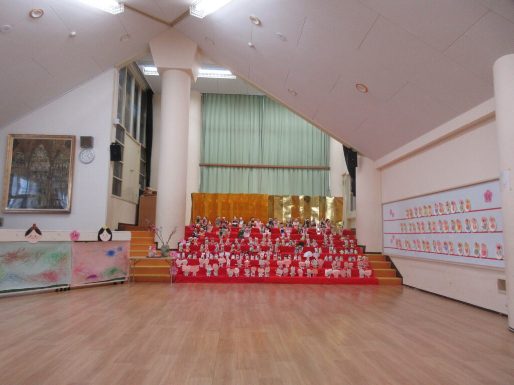 今年も、遊戯室に子どもたちのおひな様が並びました。玄関にも本物がありますが、子どものおひな様は、それにも負けない魅力があります。
