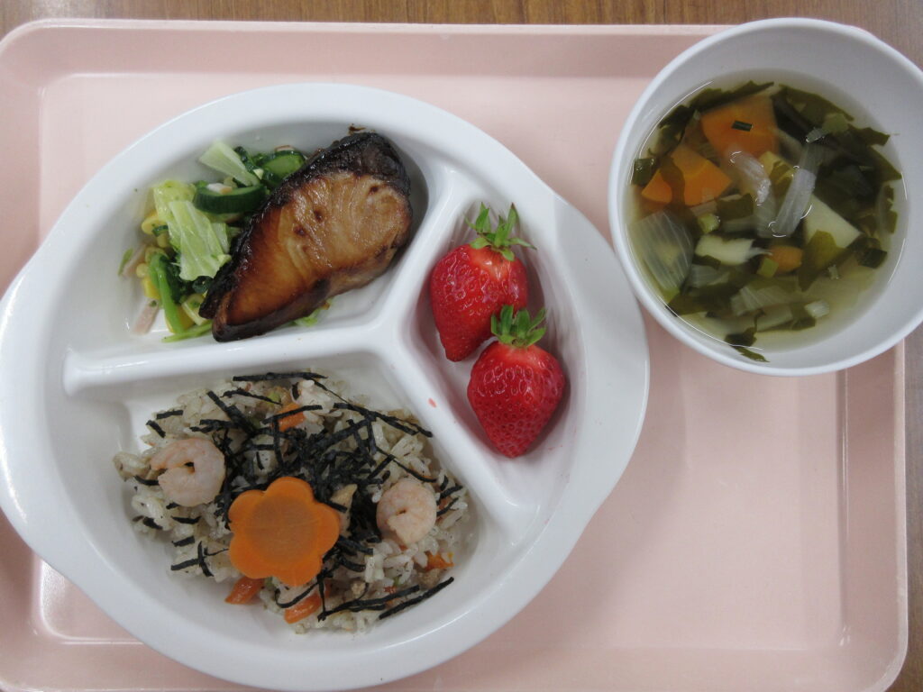 今日の献立は給食の先生が考えて、春らしいひな祭り献立です!内容は、ちらしずし・ぶりの照り焼き・菜の花とコーンのサラダ・わかたけ汁・いちごでした。おやつは、手作りの桜もちとひなあられでした。